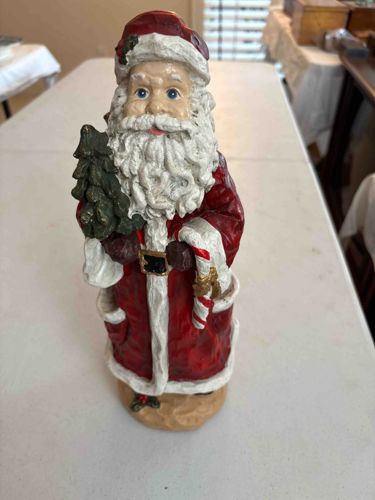This is a decorative holiday figurine depicting a traditional Father Christmas or Santa Claus, standing approximately 8 to 10 inches tall. The item is constructed from cast resin or a cold-cast plastic material, molded to simulate a hand-carved wood grain texture. The color palette features a saturated deep red for the robe and hat, white with grey shadowing for the fur trim and voluminous beard, and dark green for the miniature evergreen tree held in the right arm. Notable details include a striped candy cane tucked into the left arm, a black belt with a gold-painted buckle, and blue-painted eyes. The surface exhibits a matte finish with some subtle distressing to suggest a folk-art style. The condition appears fair to good, with some minor paint loss and scuffing visible on high-relief areas such as the beard and hat brim. There are no immediate signs of major structural repair, though the base shows slight wear consistent with display use. The overall craftsmanship suggests a mass-produced seasonal collectible likely dating from the late 20th to early 21st century (circa 1990-2010).