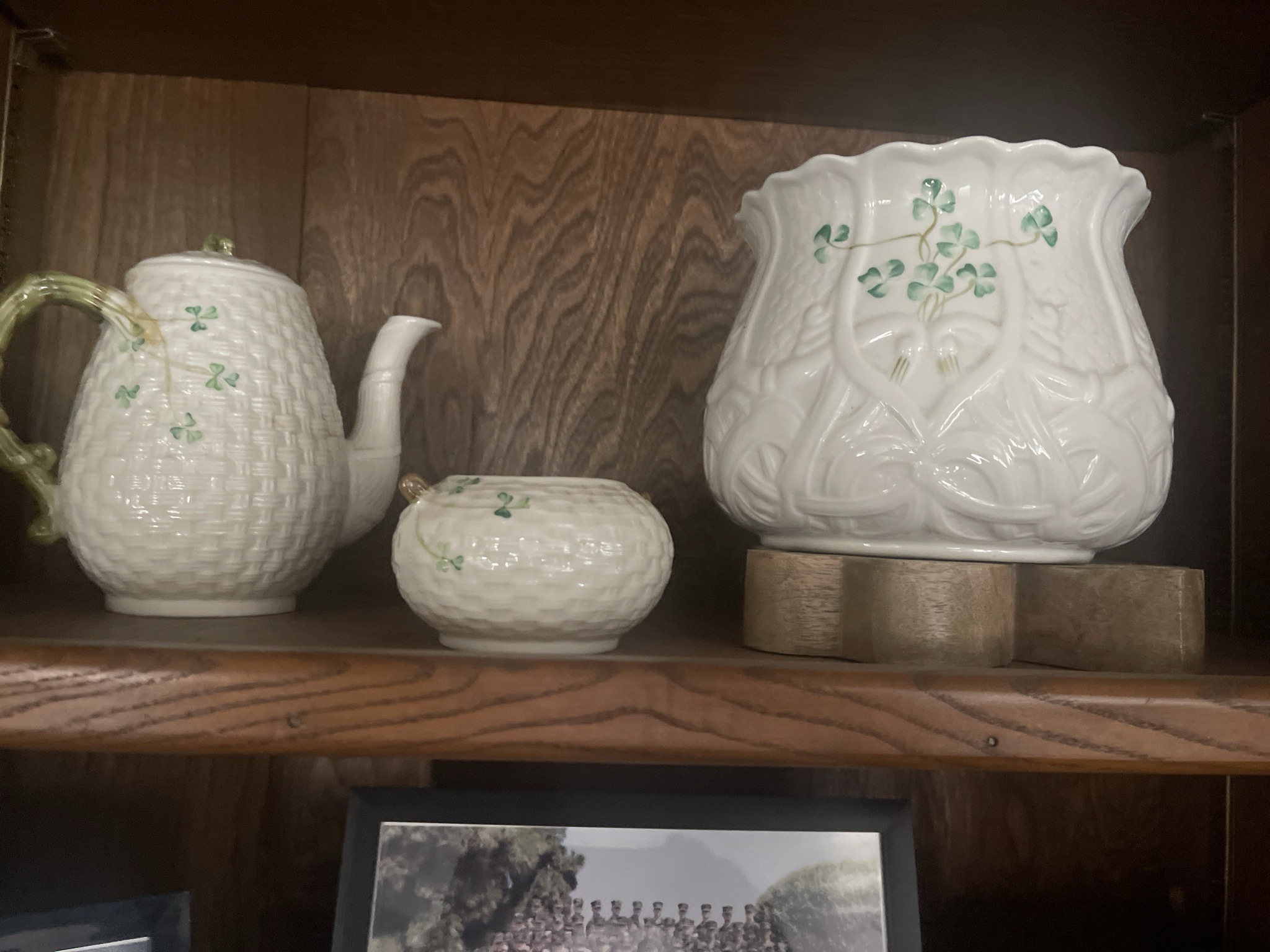 Belleek Porcelain Basketweave and Shamrock Tea Set and Planter