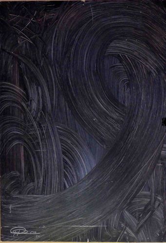This artwork is a contemporary abstract painting executed with paint on paper, measuring 2194 x 3213 units (likely pixels in this context or original dimensions of approximately 21 x 32 inches). The composition is characterized by heavy, gestural brushstrokes or technical scraping maneuvers that create broad, rhythmic arcs and swirling patterns across the entire surface. The color palette is predominantly dark, featuring deep indigo, black, and violet hues, with lighter silvery-grey highlights that reveal the directional texture of the paint application. The vigorous, expressive movement suggests a focus on process and energy, typical of 21st-century abstract expressionist influences. In the lower left corner, there is a distinct white graphic signature or monogram alongside the date '08', indicating it was created in 2008. The edges of the paper show slight irregularities and evidence of handling, including small white abrasions or nicks consistent with age and storage without a protective frame. The overall craftsmanship displays a confident use of medium, employing sgraffito-like techniques to uncover underlying layers or simply to build a dense, sculptural surface with the paint.