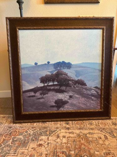 This is a large-format, framed landscape print, highly characteristic of the stylistic work of American artist Eyvind Earle. The piece depicts rolling coastal hills, likely inspired by the California central coast, rendered in Earle’s signature 'Tonalist' or 'Graphic Realist' style. The composition features a foreground hill populated by meticulously detailed, dark-profiled oak trees with rounded, geometric canopies, set against a backdrop of receding blue-toned hills and a pale, luminous sky. The color palette is composed of muted indigos, purples, and hazy blues, suggesting a late afternoon or early morning atmosphere. The piece is housed in a substantial, dark wood or composite frame featuring a wide profile with a textured, mottled finish and an inner beaded lip in a metallic bronze or gold tone. Notable craftsmanship is visible in the precision of the silhouetted foliage and the smooth transitions of the atmospheric gradients. While no signature is immediately visible in this view, such high-quality reproductions are typically serigraphs produced in the late 20th century. The condition appears fair to good, though there is a visible white scuff or scratch on the right side of the dark frame border and minor dust accumulation. The overall aesthetic is contemporary yet evokes the Mid-Century Modern design era with which Earle is famously associated through his work with Disney.