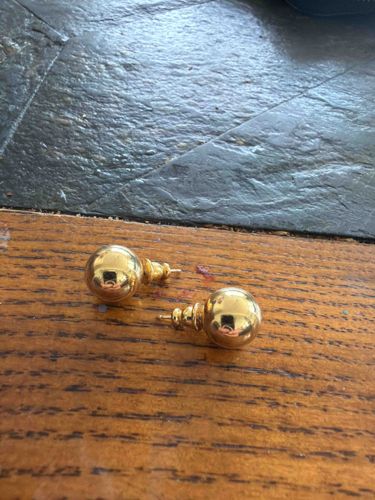 This is a pair of classic ball-style post earrings featuring a high-polish reflective finish. Each earring consists of a perfectly spherical gold-toned bead, estimated to be approximately 8mm to 10mm in diameter. The earrings are constructed with a standard straight post for pierced ears and include decorative stepped or tiered clutch-style backings, suggesting a secure larger-format butterfly or bullet-style nut. The material appears to be either solid gold (likely 10k or 14k) or a high-quality gold plating over a base metal, evidenced by the rich yellow hue and lack of visible base metal oxidation. Each sphere shows incredible smoothness with a mirror-like luster that captures the surrounding environment. No visible hallmarks or maker's marks are discernible from this angle, though they would typically be located on the posts or backings. The condition appears excellent with no significant dents, deep scratches, or tarnish, although minor surface micro-abrasions from handling may be present upon closer inspection. This timeless minimalist style is characteristic of late 20th-century jewelry design, offering a versatile aesthetic suitable for both professional and formal wear. The uniform construction and symmetry indicate quality precision manufacturing.