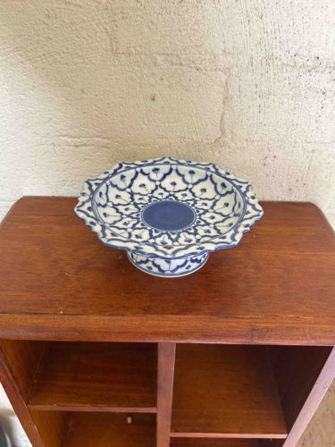 This is a vintage Thai pedestal bowl, also known as a 'Phan,' featuring a classic hand-painted blue and white porcelain design often associated with Thai 'Lai Thai' or Pineapple-cut patterns. The item consists of a shallow, scalloped-edge bowl atop a raised, flaring footed base. The construction is ceramic with a clear glaze over cobalt blue underglaze decoration. The pattern is intricate, consisting of repeating floral and geometric motifs that radiate from a solid blue circular center. The rim is distinctly lobed or barbed, mirroring the petal-like arrangement of the interior decoration. Physically, the piece appears to be approximately 6-8 inches in diameter. The blue pigment varies in intensity, showing the hand-painted nature of the craftsmanship. Regarding condition, the piece shows some light surface grime but no visible chips, cracks, or large-scale repairs are evident from the primary angle. The glaze appears bright and glassy, indicating good preservation. This style of stoneware is a 20th-century interpretation of traditional Ayutthaya or Rattanakosin period designs. It is commonly used in Thailand for ceremonial offerings, fruit displays, or as decorative centerpieces. The craftsmanship is highly detailed, with clean line work in the underglaze, suggesting a skilled artisan or a reputable Thai porcelain manufacturer such as those found in Samut Sakhon.