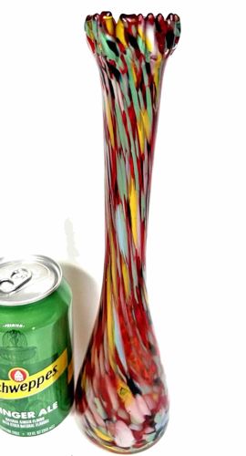 This item is a slender, blown art glass bud vase featuring a vibrant 'end-of-day' or confetti-style polychrome design. The piece stands significantly taller than the standard 12oz soda can shown for scale, likely measuring between 10 to 12 inches in height. It is constructed from clear glass embedded with an array of vertical, multicolored glass canes or frits in shades of ruby red, canary yellow, mint green, sky blue, and white. The vase exhibits a classic 'swung' silhouette, characterized by a bulbous teardrop-shaped base that tapers into a long, thin neck, terminating in an Eight-scalloped or ruffled rim with a crimped texture. This style of glassmaking, often associated with American mid-century manufacturers like Kanawha, Rainbow, or Blenko, involves 'swinging' the glass while hot to elongate the form. The craftsmanship shows good color distribution and vertical alignment of the internal glass strands. The condition appears to be excellent with no visible chips, cracks, or fleabites, and the glass retains a high luster. The base likely features a polished or snapped pontil mark characteristic of hand-blown production. This piece likely dates to the mid-20th century, approximately 1950s-1970s.