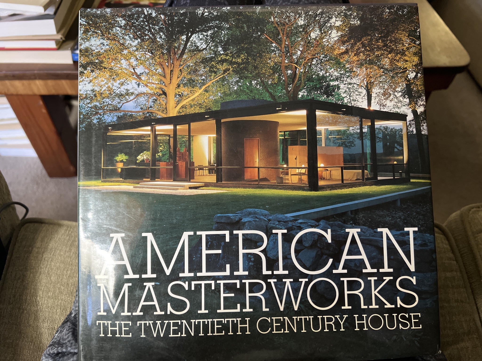 This is a large-format hardcover book titled 'American Masterworks: The Twentieth Century House,' likely a first edition or primary printing of this architectural survey. The front cover features a high-gloss dust jacket with a striking full-color photograph of Philip Johnson’s iconic 'Glass House' in New Canaan, Connecticut, captured at dusk with internal lighting. The typography is set in a bold, white serif and sans-serif font across the bottom third of the cover. Physically, the book appears to be a coffee-table style publication, characterized by its square or near-square dimensions and substantial thickness, suggesting high-quality paper stock and numerous photographic plates within. The construction involves a sewn binding visible through the tight fit of the jacket. The condition appears excellent with minimal shelf wear; the dust jacket shows a bright luster without significant scuffing, edge tears, or sun-fading on the primary face. This volume serves as a comprehensive scholarly and visual record of Modernist and mid-century residential architecture in America, typically featuring works by Frank Lloyd Wright, Mies van der Rohe, and Richard Neutra. The crispness of the corners and the lack of visible foxing or yellowing indicate a well-preserved contemporary copy, likely dating from the late 1990s to early 2000s.
