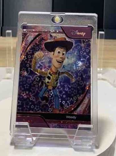 This is a high-end collectible trading card featuring the character Woody from Disney's Toy Story. The card is presented in a premium 'One-Touch' magnetic hard acrylic protector, indicating its high perceived value. Physically, the card features a standard 2.5 x 3.5 inch trading card dimension with a complex holographic foil finish, known as an 'Enchanted' rarity level, characterized by an edge-to-edge prismatic glitter or constellation-like effect. The artwork depicts Woody in a dynamic pose against a deep purple and blue cosmic background filled with stars. The top right corner displays the stylized Disney logo in gold foil. A black nameplate at the bottom identifies the character as 'Woody'. The card appears to be in 'Near Mint' to 'Mint' condition with Sharp corners and no visible surface scratches or edge wear through the case. The centering appears slightly heavy toward the bottom border. As a modern collectible from the Lorcana series (circa 2023-2024), it represents the pinnacle of modern card manufacturing, utilizing multi-layered foil printing and premium textured cardstock. There are no signs of aftermarket alteration, and the vibrant color saturation suggests excellent preservation away from UV light.