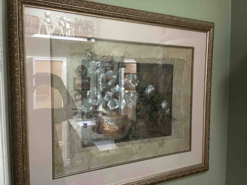 This item is a large-format contemporary art print, likely a giclee or high-quality offset lithograph, depicting a moody floral still life. The central imagery features white blossoms in a dark, textured vessel, rendered in a style that mimics traditional oil painting with heavy impasto or expressive brushwork. The print is uniquely mounted on what appears to be a secondary textured substrate, possibly burlap or a similar coarse-weave textile, creating a layered, mixed-media aesthetic. It is professionally matted with a wide, neutral-toned mat board that provides a clean border around the textured art. The ensemble is housed in an ornate, deep-profile wooden frame with a metallic gold/bronze finish. The frame features intricate floral and foliate scrolling patterns in relief, characteristic of Neo-Classical or Baroque revival styles popular in late 20th to early 21st-century interior decor. The artwork is protected by glass or acrylic glazing. While no specific maker's mark is visible through the glass, the overall construction suggests a high-end commercial gallery piece from the late 1990s to mid-2000s. The condition appears excellent with no visible foxing, fading, or moisture damage to the print or matting. The frame's finish remains intact without significant chipping, though minor dust accumulation is present in the crevices of the molding.