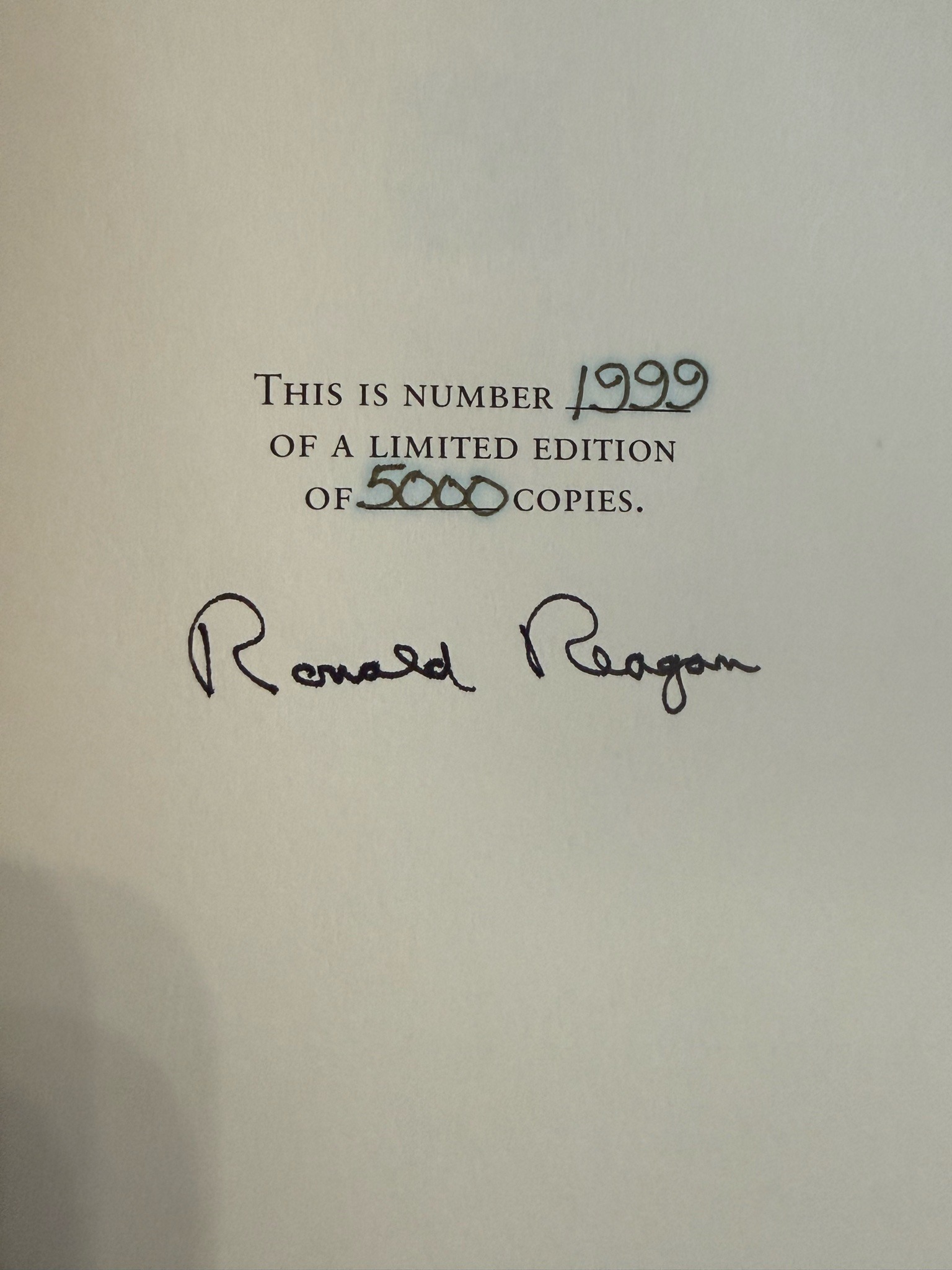 This item is a presentation page from a limited edition publication, bearing the original hand-signed signature of Ronald Reagan. The signature is rendered in dark black ink, exhibiting the characteristic fluid script and distinctive letter formations associated with his post-presidential period. Centrally positioned on high-quality, cream-colored archival paper, the page features printed text in a classic serif font stating: 'THIS IS NUMBER [1999] OF A LIMITED EDITION OF [5000] COPIES.' The numbers 1999 and 5000 have been handwritten in ink, likely by a publisher's clerk or assistant, within the designated blank spaces. The paper stock appears heavy and is in excellent condition, showing no signs of yellowing, foxing, or edge wear, which suggests it has been well-protected from UV light and humidity. Notably, the signature occupies a significant portion of the lower half of the page, demonstrating strong contrast and no visible fading. The craftsmanship reflects an official sanctioned release, typical of commemorative political memoirs or authorized biographies produced in the late 20th century, specifically the early 1990s. The authenticity of such a piece is often verified by its inclusion within the bound volume of the 5,000-copy run, making the 1999/5000 designation a critical provenance marker.