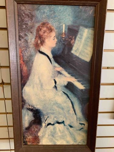 This item is a framed reproduction of an impressionist painting, likely a print or lithograph, depicting a woman seated at a piano. The style strongly suggests it is a reproduction of 'Madame Charpentier and Her Children' by Pierre-Auguste Renoir, specifically showing Madame Charpentier, or 'Woman at the Piano' by Renoir. The artwork is housed within a dark brown wooden frame, which appears to be a simple, perhaps mass-produced, design with a flat profile and a visible grain. The frame shows minor wear and scuffs consistent with age and handling. The colors of the print are soft and characteristic of Renoir's impressionistic style, featuring a woman with reddish-brown hair, wearing a flowing white or light blue dress with dark ribbon accents, possibly black. She is positioned in profile, looking towards the sheet music on the piano. A candlestick with a lit candle is visible on the piano, adding a warm glow to the scene. The background is rendered with loose brushstrokes in shades of blue and darker, undefined tones, creating a sense of depth and atmosphere. The print itself appears to be in fair condition, with no obvious signs of significant damage like tears or major discoloration, although the overall clarity and vibrancy might be slightly muted due to age or the quality of the reproduction process. The texture implied by the brushstrokes is visible, suggesting a good quality print that captures some of the original painting's characteristics. The piece likely dates from the mid to late 20th century, given its commonality as a decorative art print. The overall impression is one of a classic, elegant scene, reproduced for broad decorative appeal.