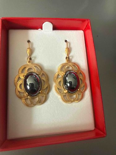 Vintage Gold-Tone Filigree Hematite Cabochon Earrings