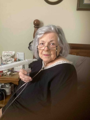 This item is a composite home medical oxygen delivery system consisting of several specialized components. The primary focus of the assembly is a flexible, white corrugated plastic hose attached to a clear plastic nebulizer chamber, which allows for the aerosolization of liquid medication for inhalation. Connected to this is a fine-gauge, transparent plastic tubing that transitions into a nasal cannula, designed to be worn around the ears and placed in the nostrils for continuous supplemental oxygen delivery. The materials are medical-grade plastics and polymers, predominantly clear and white in color. Visible in the background is a wood-framed bed and several canisters of Luden's brand throat lozenges, indicating ongoing respiratory care. The equipment appears to be in current use, showing common signs of handling such as slight bending of the tubing but no significant structural damage or wear. These systems are standard modern medical devices manufactured for durability and hygiene in a domestic setting, typically reflecting late 20th to 21st-century manufacturing standards. The craftsmanship is industrial-grade, emphasizing utility and patient safety over aesthetic design.