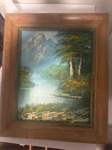 This is a rectangular oil landscape painting, likely executed in the mid-20th century, following the stylistic conventions of the 'wet-on-wet' technique popularized by artists like Bill Alexander and Bob Ross. The composition features a prominent, snow-dusted jagged mountain peak in the background, set against a hazy blue sky. In the mid-ground, a calm turquoise lake reflects the light, flanked by thick coniferous and deciduous foliage in shades of olive, ochre, and deep green. The foreground showcases a rocky shoreline with small botanical accents applied with textured impasto brushwork. The painting is housed in a wide, beveled wooden frame with a medium honey-oak finish and a thin green-painted inner liner that complements the forest tones of the artwork. Regarding condition, the frame exhibits visible wear, including surface abrasions, scuffing on the corners, and several red and blue pigment marks on the lower edge, suggesting it has been handled or stored without protection. The canvas appears stable, though there is potential yellowing of the varnish consistent with age. This piece is typical of mass-market decor art or hobbyist work from the 1970s-1980s, characterized by quick, gestural fan-brush techniques for the trees and palette-knife applications for the mountain textures.