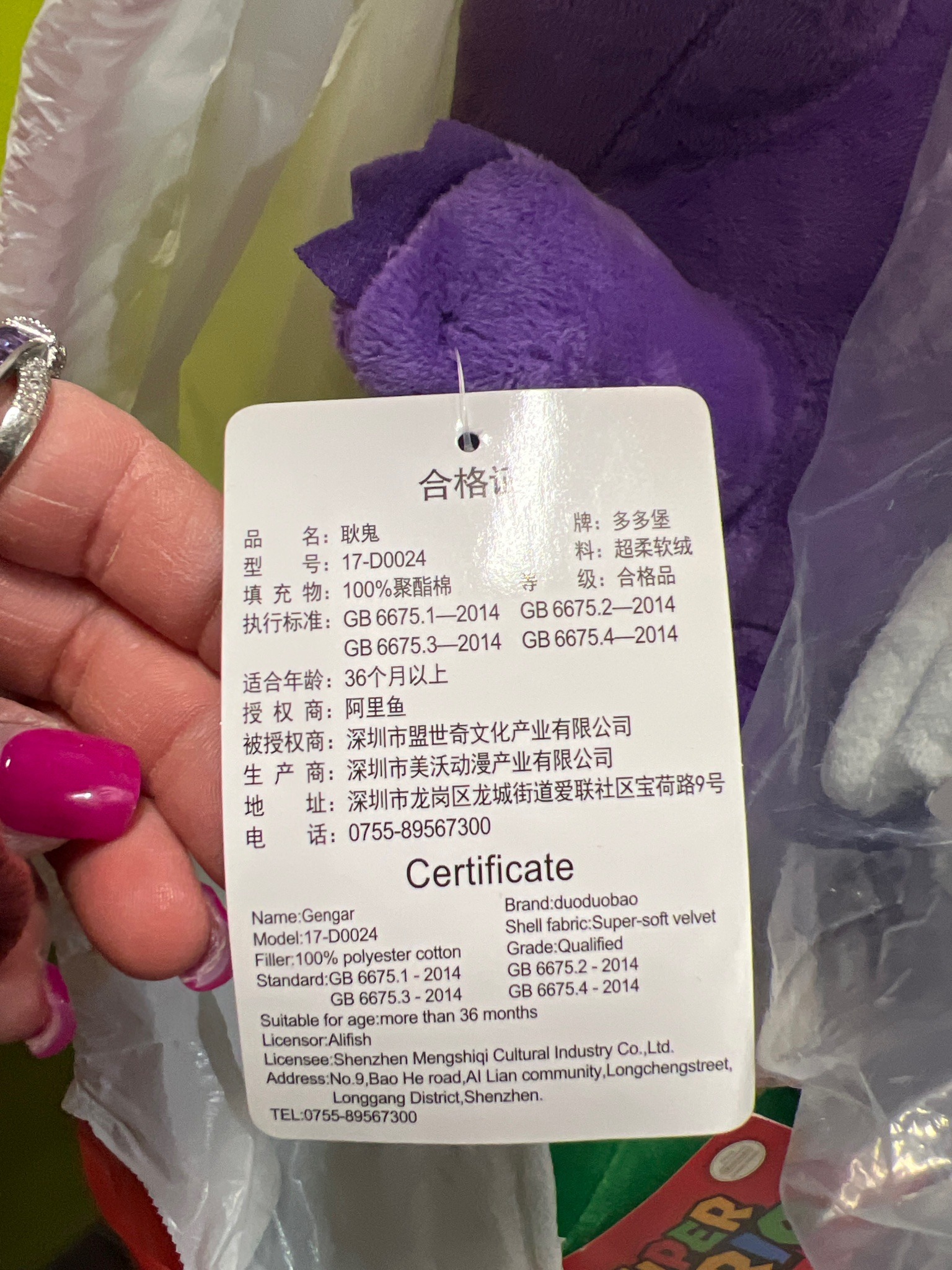 This item is a purple plush toy representing the Pokémon character Gengar. The product is partially visible, showing a vibrant, deep purple faux-fur or 'super-soft velvet' exterior as indicated by the official product tag. The tag identifies the item as model 17-D0024, manufactured by Shenzhen Mengshiqi Cultural Industry Co., Ltd. and licensed through Alifish. The interior is composed of 100% polyester cotton filling. The construction features machine-stitched seams and a plush, soft-touch texture designed for children over 36 months of age. The tag is white with black printed text in both Chinese and English, including a 'Certificate' header and compliance with standard GB 6675.1-2014 through GB 6675.4-2014. The item appears to be in new, unused condition, still attached to its original retail hangtag via a plastic fastener and partially enclosed in a clear protective plastic shipping bag. No visible wear, stains, or fraying are present. This contemporary mass-produced collectible represents modern pop-culture merchandise originating from Shenzhen, China, under a specific licensing agreement.