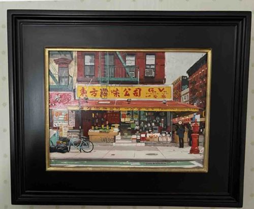 This is an original oil painting by the acclaimed contemporary realist artist Vincent Giarrano, measuring 9x12 inches. The work depicts a vibrant, detailed urban scene centered on an Oriental trading company or grocery store, likely situated in Chinatown, New York. The composition features a yellow storefront sign with Chinese characters and the artist's initials 'G.V.' incorporated into the signage design. The painting is executed in a contemporary realist style, showcasing Giarrano's mastery of light, texture, and urban grit. Notable details include a blue bicycle parked in the foreground, meticulously rendered fire escapes, stacked produce crates, and a red fire hydrant. The brushwork is confident and painterly, capturing the atmospheric quality of a busy city morning. The piece is housed in a substantial, high-quality black exhibition frame with a gilded inner fillet that provides a striking contrast and draws the eye toward the warm tones of the masonry and signage. The condition appears to be excellent, with no visible signs of craquelure, paint loss, or surface grime. The colors remain saturated and the highlights contribute to a strong sense of three-dimensionality. Dating from the 21st century, this piece represents the artist's ongoing exploration of contemporary life and cityscapes, characterized by high-level craftsmanship and an authentic narrative feel.