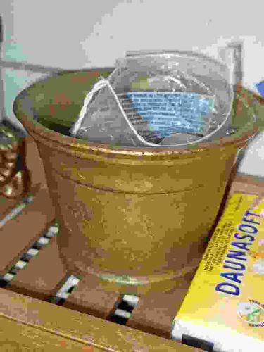 This item is a circular, tapered jardinière or planter pot, likely made of earthenware or stoneware. It features a medium-gold or ochre-toned glaze applied over a textured ceramic body. The pot has a distinct flared rim with a slightly raised edge, while the body tapers downward to a smaller base. The exterior surface exhibits horizontal bands or rings, indicating it was likely thrown on a potter's wheel. In terms of condition, there is visible chipping along the upper rim, revealing the lighter-colored clay body beneath the glaze, and the surface shows overall crackle and minor abrasions consistent with frequent use and exposure to moisture. The finish is semi-matte with a slight metallic sheen in certain lighting. There are no visible maker's marks or signatures on the exterior wall. This style of utilitarian pottery is common in the late 20th century. Inside the pot, a clear plastic container with blue and white labeling is being used as an improvised liner or storage insert. The pot is currently resting on a slatted wooden bench or surface next to a yellow 'DAUNASOFT' branded product box.