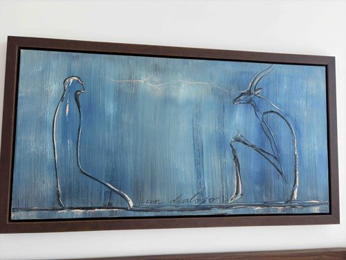This is a horizontal rectangular artwork featuring a minimalist, expressive composition. The piece depicts two figures in profile facing one another: a simplified human form on the left and a horned, deer-like creature on the right. Both figures are rendered using fluid, gestural outlines in a light, possibly metallic or white pigment, which creates a sense of ethereal presence. The background is a rich, textured blue with vertical brushstrokes and sgraffito-like markings that suggest rain or light filtering through wood. Centered at the bottom, cursive script reads '...un dialogo', suggesting the title of the work. The medium appears to be oil or acrylic on canvas or board, possibly with impasto and mixed media elements. The work is housed in a dark brown, contemporary floater frame with clean lines. The condition appears excellent with no visible fading, craquelure, or damage to the frame. The style is contemporary semi-abstract, likely dating from the 21st century. The use of negative space and the delicate connection between the two figures via a thin line of light above them emphasizes a spiritual or communicative theme.