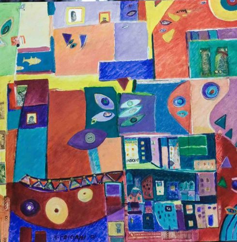 This is a vibrant and complex mixed media artwork on a square format, likely paper or a composite board, dated '01 (2001). The composition is a dense, non-linear narrative combining painting—likely acrylic or gouache—with collage elements. The color palette is exceptionally broad, featuring saturated primary and secondary hues organized into a grid-like but organic patchwork of rectangular and irregular cells. Notable features include the recurring motif of stylized, almond-shaped 'eyes' scattered throughout the piece, suggesting themes of surveillance or multisensory perception. The collage elements are particularly significant, incorporating international currency (specifically what appears to be Brazilian Cruzados or similar South American banknotes), small portrait cutouts, and textural paper scraps. The lower section features a prominent brick-red arc adorned with circles and a serrated mechanical-looking line. A signature and date in the bottom center read 'M. PEIGAN 01'. The craftsmanship displays a confident use of layers and varying opacities, typical of contemporary Outsider or Neo-Expressionist styles from the early 21st century. The condition appears stable with clean edges, though there is natural surface texture variation inherent to the mixed media process and potential minor yellowing of collaged paper edges due to age-related oxidation.