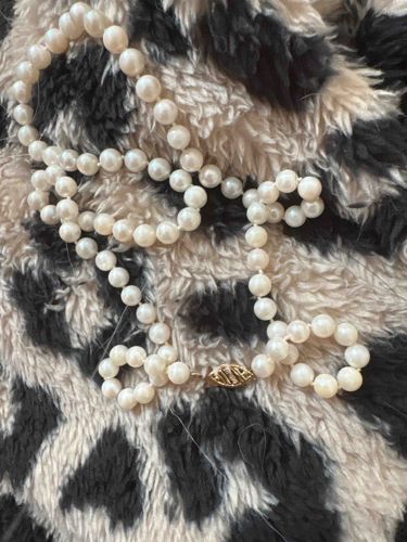 This item is a single-strand classic pearl necklace, approximately 18 to 22 inches in length. It features spherical pearls with a creamy white luster and subtle iridescent overtones. The pearls appear to be cultured, possibly Akoya or high-quality freshwater, though a lab test would be required for confirmation. Each pearl is individually knotted on a silk or nylon thread, a hallmark of fine craftsmanship that prevents the pearls from rubbing against one another and ensures security should the strand break. The individual pearls show slight variations in shape and surface texture, suggesting a natural organic origin rather than machine-made synthetic beads. The necklace is secured with a traditional marquise-shaped filigree safety clasp, crafted from a yellow-tone metal, likely 10k or 14k gold, which is consistent with mid-to-late 20th-century jewelry styles. Visible condition appears fair to good, though some loose fibers and surface lint are present on the strand. There is no immediate evidence of nacre peeling, but a professional cleaning and possible restringing would be recommended to preserve its longevity. The overall aesthetic is one of timeless elegance, typical of pieces from the 1960s through the 1980s.