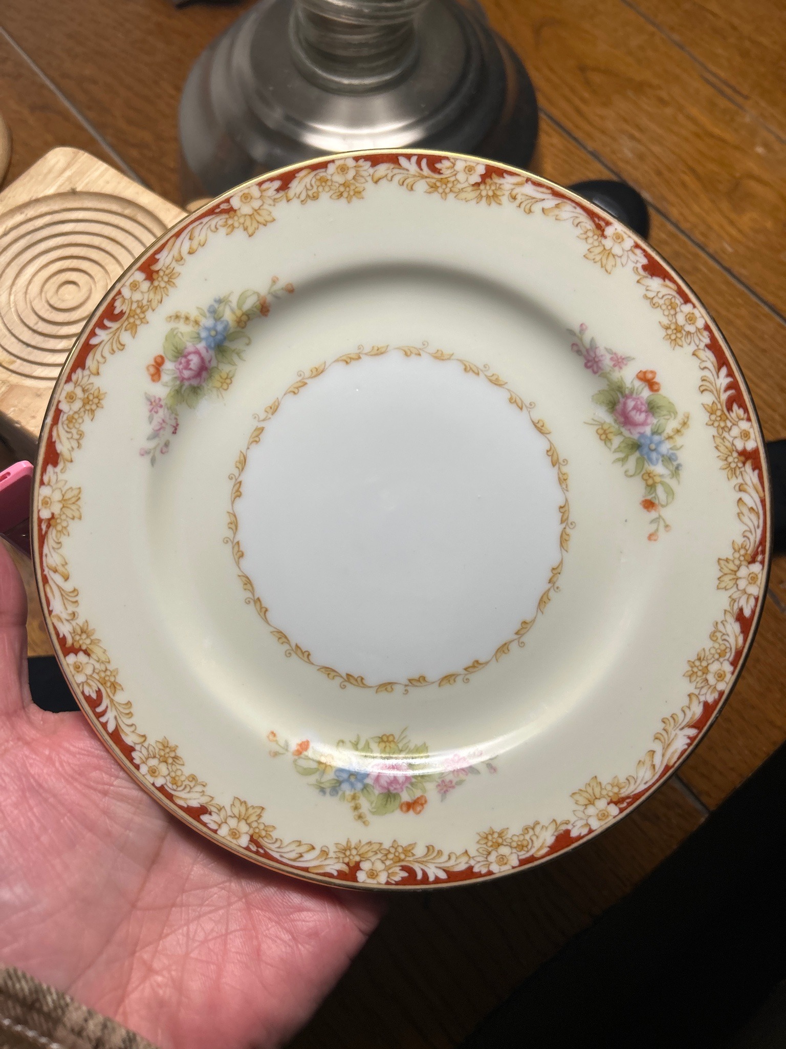 This is a circular bread and butter plate, approximately 6 to 6.5 inches in diameter, crafted from fine bone china or porcelain. The plate features a complex, multi-layered decorative scheme characteristic of mid-20th-century Japanese fine dining sets. The outermost edge is finished with a hand-applied gold gilt rim. Moving inward, a prominent russet or iron-red border serves as the foundation for a continuous cream-colored floral scroll motif. The wide rim (marli) displays three equidistant floral sprays featuring pink roses, blue forget-me-nots, and yellow field flowers, executed in a delicate transfer-ware style with possible hand-painted accents. A secondary golden laurel or stylized feather ring defines the transition from the shoulder to the well of the plate. The center (well) is a clean, bright white glaze, contrasting slightly with the creamier ivory tone of the rim. The plate shows signs of light vintage wear, specifically minor thinning of the gold gilding on the outermost edge and faint surface scratches from utensil use in the center. The craftsmanship is of high quality, likely dating from the 1940s to the 1960s, a period when Japanese manufacturers like Noritake mastered this neoclassical-cum-floral aesthetic for the export market. There are no visible chips, cracks, or crazing, suggesting well-maintained condition.