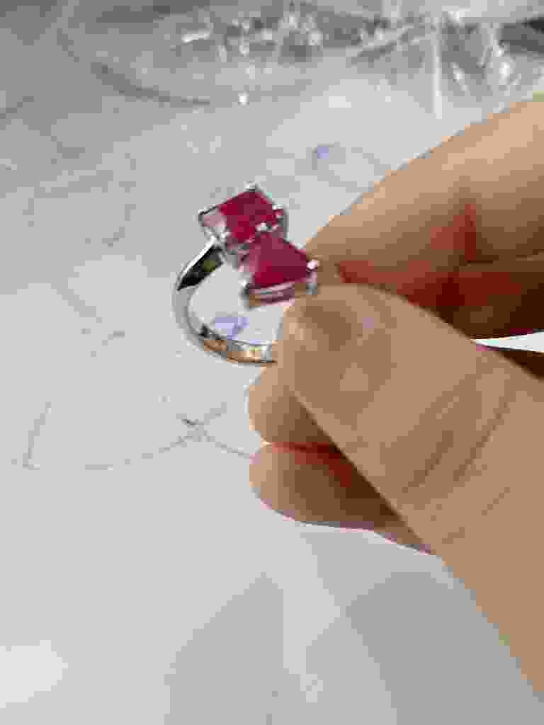 This is a contemporary fashion ring featuring a 'Toi et Moi' (You and Me) bypass design. The piece features two prominently sized gemstones, both appearing to be rectangular emerald-cut lab-created or synthetic rubies characterized by a vibrant, saturated pinkish-red hue. The stones are set in a highly polished white metal band, likely sterling silver or white gold-plated brass, given the commercial appearance of the setting. Each stone is secured by four substantial corner prongs, which provide a modern and geometric aesthetic. The stones are arranged in a staggered, diagonal bypass orientation, creating a dynamic visual flow. In terms of physical condition, the metal shows a reflective, mirror-like finish with minor surface abrasions consistent with light handling. The gemstones exhibit high clarity with no visible inclusions under the current lighting, which is a common indicator of synthetic origin. The overall style is consistent with 21st-century costume or bridge jewelry, prioritizing bold color and contemporary geometric forms over traditional fine jewelry proportions. No discernible maker's marks or hallmarks are visible on the exterior of the shank. The craftsmanship appears clean with uniform prong placement, though it retains the characteristics of mass-produced jewelry rather than bespoke artisanal work.