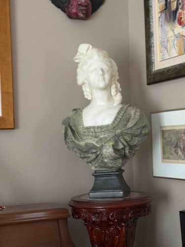 This is a detailed portrait bust depicting a woman in 18th-century fashion, likely crafted in the late 19th or early 20th century in the Neoclassical or Romantic tradition. The sculpture is constructed using two distinct types of stone to create a striking contrast: a white, translucent material (likely alabaster or Carrara-type marble) for the head, neck, and chest, and a variegated green-grey veined stone for the ornate drapery of her square-necked gown. The figure features a tall, powdered-style ‘pouffe’ hairstyle adorned with a bow or ribbon, with long curls cascading down the sides of her neck. The craftsmanship shows significant attention to the texture of the fabric, with deep folds and a ruffled neckline. The bust is mounted on a dark, possibly slate or blackened stone socle base with a stepped profile. Regarding condition, there appears to be some minor surface soiling and a slight patina characteristic of aged stone. The face has somewhat soft features, suggesting the use of alabaster, which allows for light penetration but is prone to minor surface abrasions over time. No major fractures or repairs are immediately visible, though the join between the two stone types is a critical point for structural integrity. The style reflects the Grand Tour aesthetic popular with collectors who desired classical European-influenced decor.
