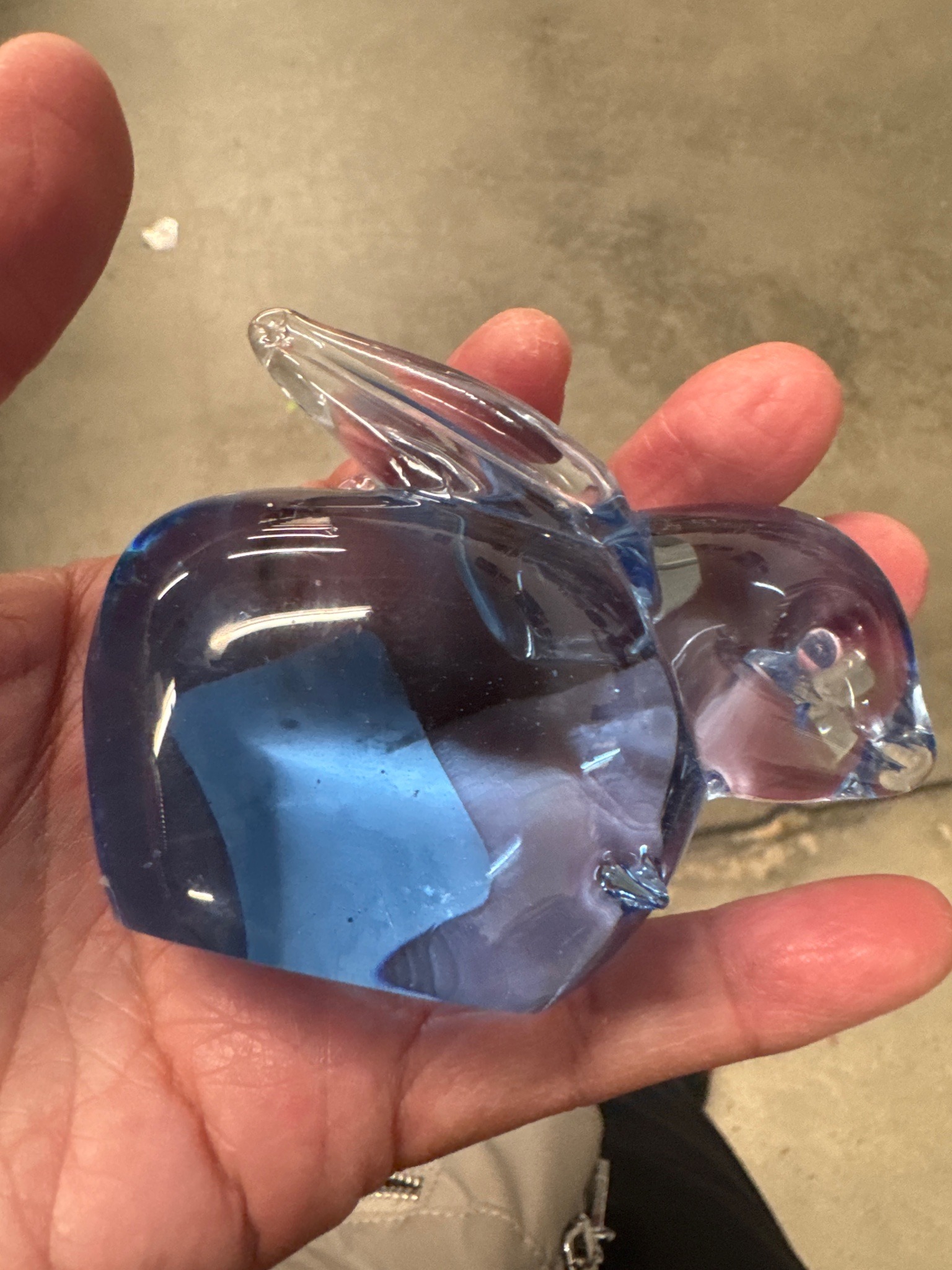 This is a hand-blown art glass figurine depicting a stylized rabbit or bunny, approximately 3 to 4 inches in length. The piece is crafted from solid, translucent glass with a distinct blue-to-lavender gradient. It features a rounded, heavy body typical of paperweight-style sculptures, with applied glass elements forming the ears and tail. A notable feature is the controlled internal air bubble decoration and what appears to be a copper-toned or dichroic eye element, adding a whimsical touch to the face. The construction demonstrates solid-glass 'sommerso' techniques where colors are layered within clear glass. The ears are pulled and smoothed, showcasing a tapered finish typical of mid-to-late 20th-century artisan glasswork. Condition-wise, the item shows minor surface scratches and fingerprints, but no visible chips or major fractures are apparent on the main body. The base appears to be flat-ground, which is a sign of manual finishing. While no maker's mark is visible in the photograph, the style and coloration are evocative of mid-century modern glass animals produced by various factories in Murano, Italy, or by American companies like Blenko or Kanawha. The overall craftsmanship is high, evidenced by the fluid lines and the clarity of the glass.