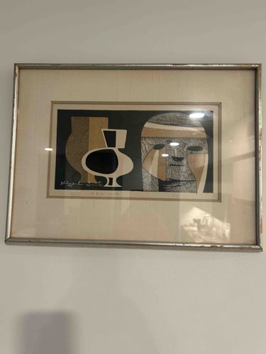 This is a mid-century modern woodblock print by the renowned Japanese artist Kiyoshi Saito (1907-1997). The artwork features a horizontal composition on a black ground, depicting two stylized ceramic vessels to the left and a haniwa-style or Maiko head on the right. The color palette is characteristic of Saito's Sōsaku-hanga style, utilizing earthy ochre, warm browns, cream, and deep black. The print exhibits intricate wood grain textures, particularly visible in the large vase and the striped facial details, which were achieved through the artist's masterful use of the wood block's natural surface. This piece is signed 'Kiyoshi Saito' in white ink on the lower left of the print surface, with additional pencil notations for the title and edition number (appearing to be 5/50) in the lower margin. The print is housed in a contemporary silver-toned metal frame with a wide, off-white fabric-textured mat. Condition-wise, the frame shows some visible surface scuffing and minor oxidation. The matting appears original but exhibits some light vertical toning consistent with age. The print itself appears to be in good stable condition with vibrant ink saturation, though it has not been examined out of the frame for potential foxing or adhesive residue on the reverse. This work likely dates from the 1950s or 1960s, reflecting the post-war Japanese print movement's blend of traditional techniques and modern abstraction.
