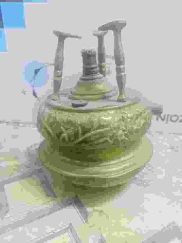 This item is a vintage portable pressure stove, often referred to as a ‘Primus’ stove, constructed primarily from brass. The main body consists of a bulbous, pressurized fuel reservoir (fount) featuring a decorative repoussé or embossed floral pattern encircling the center. The stove stands on a flared base and features several functional components on the top surface, including a central riser for the burner assembly (now missing its outer silent or roarer cap) and three vertical support legs with turned architectural detailing, designed to hold a pot or pan. The brass exhibits a significant aged patina with greenish oxidation and surface grime, suggesting it has not been polished in decades. There are signs of heavy use, including carbon buildup around the burner and potential surface pitting. This style of stove was popularized in the early to mid-20th century (circa 1920-1950) for camping and domestic use in regions without reliable gas lines. No maker's mark is clearly visible due to the image quality and patina, but typical manufacturers include Primus, Optimus, or various manufacturers from the Middle East and India. The craftsmanship is evident in the decorative metalwork, which distinguishes it from purely utilitarian industrial models.