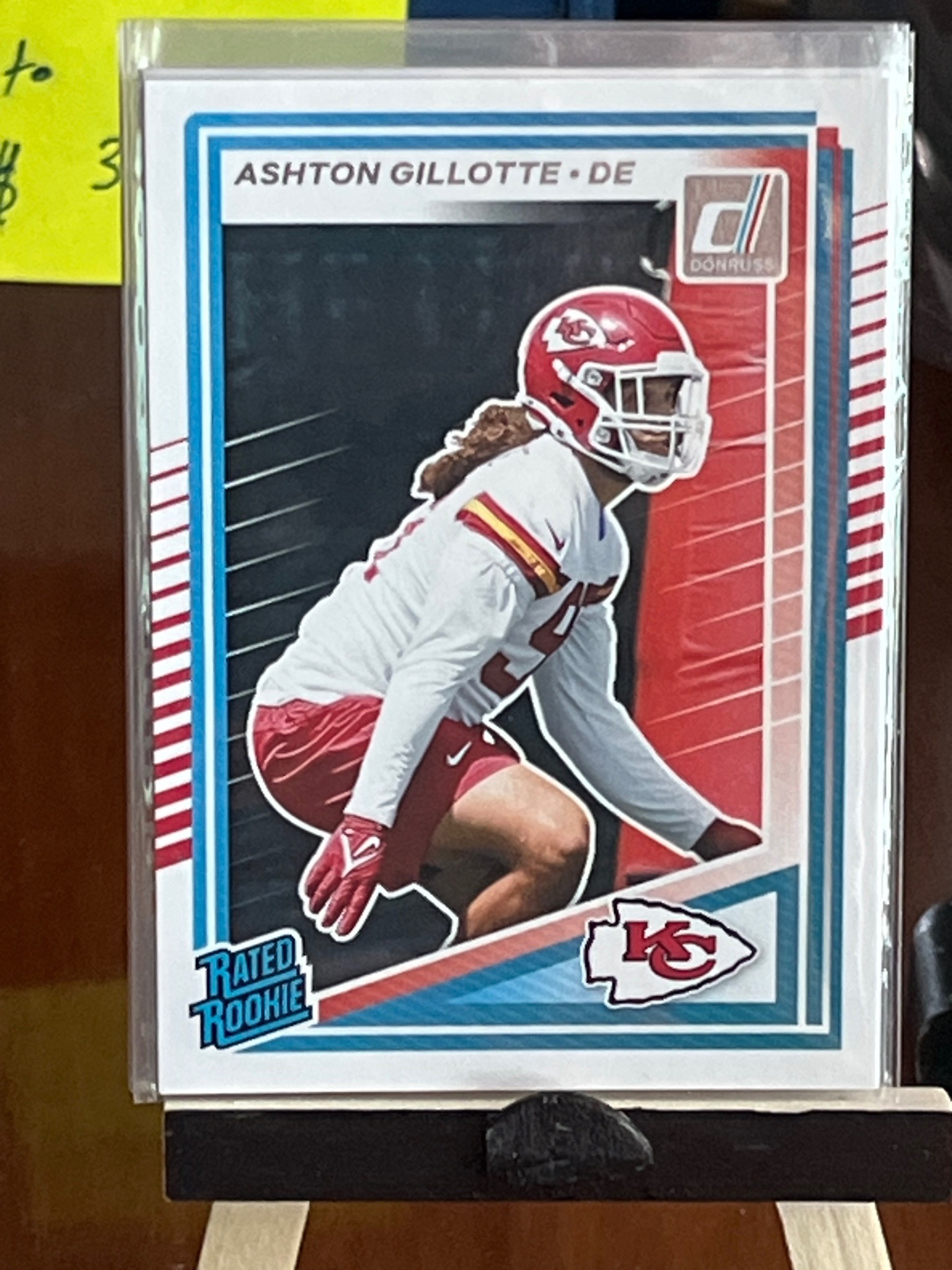 This is a contemporary standard-sized trading card featuring Ashton Gillotte (Defensive End) for the Kansas City Chiefs. The card belongs to the prestigious 'Rated Rookie' subset of the Panini Donruss brand. The graphic design features a white border with a distinctive blue internal frame. A multi-colored background of black, red, and blue with diagonal white line accents surrounds the central dynamic action photo of the player in a three-point stance. The player is shown wearing a Kansas City Chiefs helmet, white jersey, and red pants. The Donruss brand logo is positioned in the upper right corner, while the 'Rated Rookie' logo is in the bottom left, and the Chiefs team logo is in the bottom right. Based on the player and design style, this is likely from the 2024 production year. The card appears to be in excellent condition, housed within a clear protective plastic sleeve and outer top-loader, which has preserved the sharpness of the corners and the integrity of the edges. There is no visible fading, surface scratching, or manufacturing defects discernible in the current viewing. The printing quality is high, with vibrant color saturation and crisp text alignment typical of modern Panini sports card manufacturing standards.