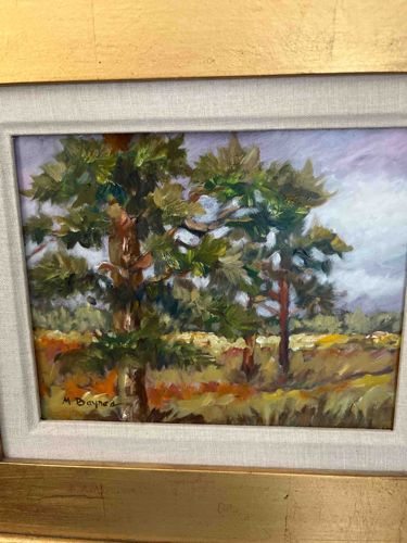 This is a small-format impressionist oil painting on board or canvas panel, featuring a landscape with prominent pine trees. The artist, signed 'M. Baynes' in the lower-left corner in a dark pigment, employs an impasto technique with visible, confident brushstrokes that suggest movement and light. The palette consists of earthy ochres, deep greens, and warm siennas in the foreground, contrasted against a muted lavender and grey-blue sky, indicating a late afternoon or overcast setting. The painting is professionally housed in a multi-layered frame consisting of a light grey or oatmeal-colored linen liner and a wide, gilded wood outer frame with a gold-leaf finish. The frame displays a slight texture and a soft luster characteristic of mid-to-late 20th-century gallery framing. Physically, the artwork appears to be in good vintage condition with no immediate signs of paint loss, flaking, or significant discoloration. The construction quality is high, with the linen liner providing a clean transition between the active brushwork of the painting and the formal aesthetics of the gold frame. Based on the style, framing materials, and signature, this piece likely dates from the 1970s to the 1990s. The artist is likely a skilled regional or listed painter known for plein air landscapes.