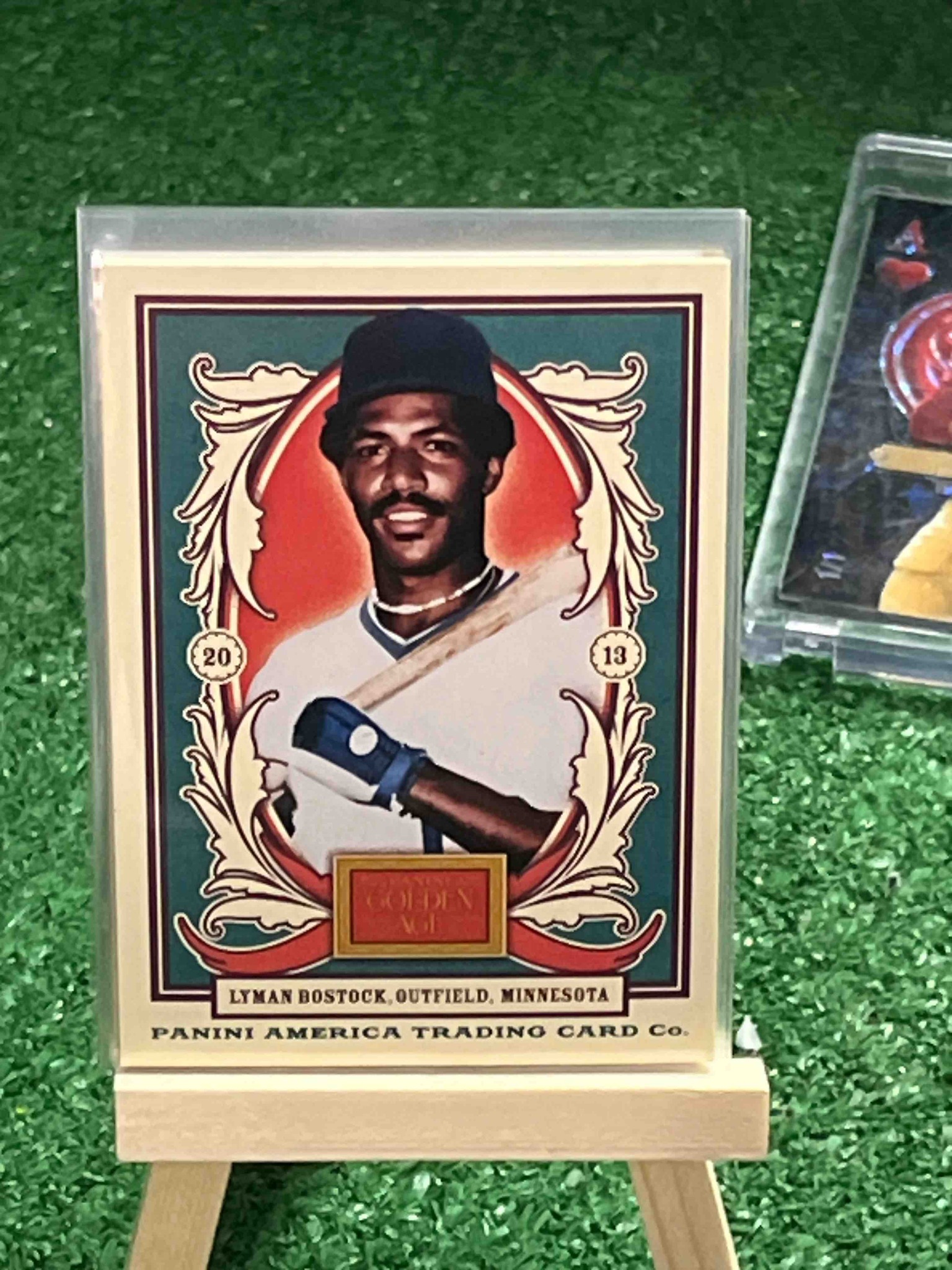 This is a standard-sized modern baseball trading card featuring Lyman Bostock, produced by Panini America as part of their 2013 'Golden Age' series. The card features a retro-inspired aesthetic with an illustrative portrait of the player against a red gradient background, framed by ornate cream-colored scrolls and floral flourishes. The outer border is a deep forest green, contained within a cream perimeter. The layout includes the year '2013' split into two small circular emblems flanking the central portrait. The player's name and team details ('Lyman Bostock, Outfield, Minnesota') are printed at the bottom in a classic serif font, above the 'Panini America Trading Card Co.' branding. The card is encased in a protective plastic sleeve and displayed on a miniature wooden easel. Regarding condition, the card appears to be in excellent state with sharp corners and clean edges visible through the sleeve. The centering looks balanced, and the print quality shows high saturation with no visible scratches or fading. This series was designed to evoke the classic tobacco and early gum card eras, mixing sports legends with historical figures.