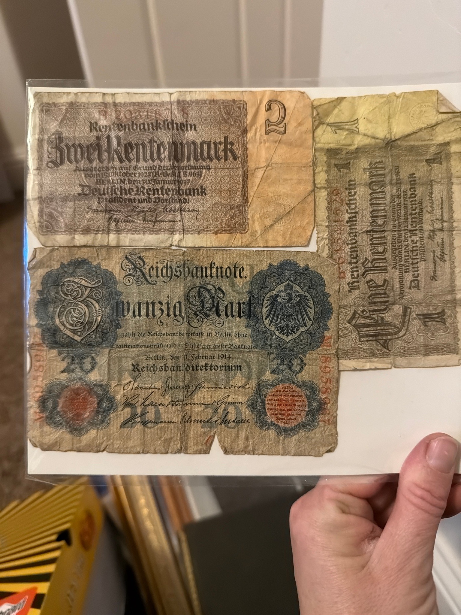Collection of German Banknotes: 20 Mark (1914), 2 Rentenmark (1937), and 1 Rentenmark (1937)