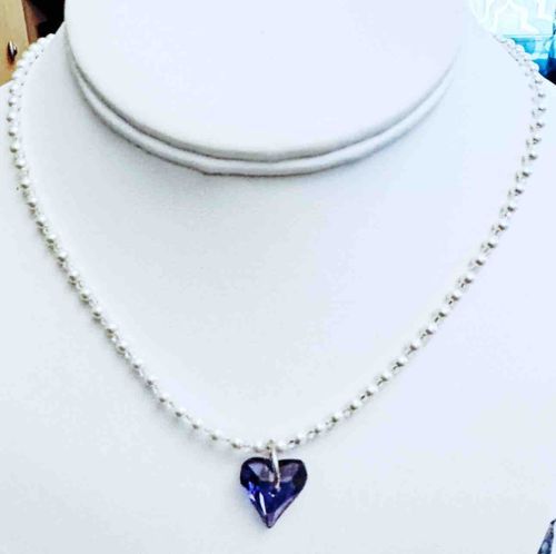 This piece of jewelry is a contemporary-style necklace featuring a prominent Swarovski crystal heart pendant suspended from a strand of faux pearl beads. The central pendant is a multifaceted crystal heart in a deep 'Heliotrope' or sapphire blue-violet hue, exhibiting the high-precision faceting and internal fire characteristic of Swarovski’s crystal-cutting techniques. The pendant is attached via a simple sterling silver jump ring bail to a uniform strand of high-quality faux pearl beads, likely Swarovski's signature leaded crystal core pearls which provide a realistic weight and luster. These pearls are approximately 4-6mm in diameter and appear to be strung on a metallic wire or cord with sterling silver findings. The construction indicates a modern costume jewelry aesthetic with premium components. The condition appears excellent with no visible chips to the crystal facets or peeling of the pearl nacre. As a modern piece, it demonstrates consistent mass-market craftsmanship focused on brilliance and durability. The sterling silver components (implied by context) likely carry a '.925' hallmark on the clasp or tag, which would verify metal purity. The design is a classic romantic motif, popular for bridal or formal gift-giving, likely manufactured within the last 15-20 years.