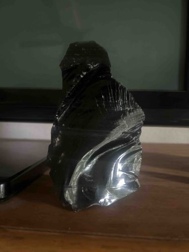 This item is a large, raw specimen of volcanic obsidian glass, characterized by its deep black color and brilliant vitreous luster. The object measures approximately 4 to 6 inches in height and exhibits prominent conchoidal fracturing across its surfaces, creating the sharp, curved ridges and wave-like patterns typical of rapid cooling volcanic material. The exterior shows a play between highly reflective, glossy facets and duller, matte areas where the surface is less newly exposed. Physically, it is an amorphous solid with an irregular, vertical silhouette. There are no visible maker's marks, as this is a natural geological specimen. The condition appears stable, though the edges are inherently sharp and prone to micro-chipping if handled roughly. The material shows a slight transparency along the very thinnest edges when back-lit, suggesting it may be a smoky or sheen variant. Its craftsmanship is defined by nature, evidencing the raw energy of its formation. It is a classic decorative mineral specimen that serves as a high-quality example of natural igneous glass.