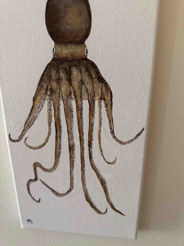 This is a contemporary piece of wall art featuring a stylized octopus rendered on a rectangular, vertically oriented canvas. The artwork is characterized by its minimalist aesthetic, set against a stark, unpainted white canvas background that emphasizes the subject matter. The octopus is executed in a palette of earthy, sepia-toned browns and blacks, with subtle gradients and shading that give the mantle (head) a rounded, three-dimensional appearance. The eight tentacles extend downwards in varied, fluid positions, featuring fine stippled detailing to suggest the texture of suckers. The construction appears to be acrylic or oil paint on a pre-stretched, machine-woven cotton canvas, wrapped over a wooden frame, typical of modern hobbyist or decorative retail art. The eyes are small, white dots that provide a sharp contrast to the dark skin of the cephalopod. The paint application is relatively thin, showing the texture of the canvas weave throughout. In the lower-left corner, there is a small, dark monogram or artist's signature consisting of two initials (resembling 'Ky' or 'Kg'). The condition appears excellent, with no visible signs of foxing, paint loss, or cracking, suggesting a production date within the last 10-15 years. The craftsmanship is clean and deliberate, leaning towards a coastal or nautical decorative style.