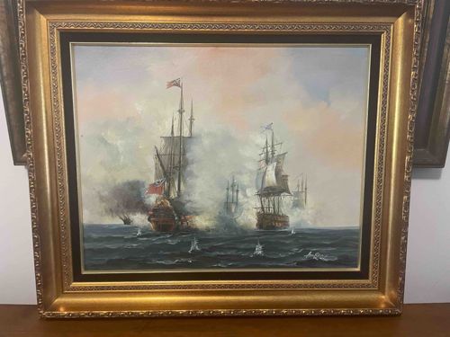 A striking oil painting on canvas depicting a dramatic 18th-century style naval engagement at sea. The composition features multiple three-masted ships of the line amidst plumes of white cannon smoke, with a central vessel flying a red ensign and a white flag with a blue cross (indicative of historical British or Scottish naval flags). The sea is rendered in deep indigo and grey-greens with white-capped swells, while the sky utilizes a soft pastel palette of peach, pink, and ivory, suggesting a dawn or dusk setting. The brushwork is impressionistic yet detailed in the rigging and hulls. The painting is housed in a contemporary, heavy-molded composite frame with a vibrant gold-gilt finish, featuring a tiered design with ornate beading and a dark navy blue or black inner wooden liner that serves as a visual fillet. The overall condition appears excellent with no visible surface cracking, paint loss, or foxing on the canvas. The frame shows minor signs of shelf wear but remains structurally sound. The style is reminiscent of traditional marine artists like Ivan Aivazovsky, though likely produced in the late 20th century as a decorative fine art piece. A signature is present in the lower right corner, though it is stylized and difficult to attribute to a specific listed master without further provenance.