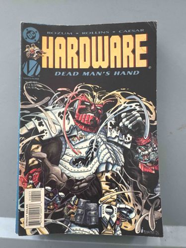 This is a physical copy of the DC Comics/Milestone Media comic book 'Hardware', specifically issue #42 titled 'Dead Man's Hand'. The cover art features the titular character of Hardware in a dynamic, high-detail action pose against a black background. The artwork displays complex mechanical details and a color palette dominated by white armor plating, red mechanical accents, and gold metallic flourishes. Printed in the mid-1990s (approx. 1996), the comic exhibits standard Modern Age dimensions (approx. 6.625 x 10.25 inches) with a glossy paper cover and staple-bound construction. Visible credits on the cover include creators Rozum, Rollins, and Caesar. Notable markings include the DC and Milestone logos, a Direct Sales barcode in the bottom left corner, and a price point of US $1.95 / CAN $1.50. Condition-wise, the comic appears to be in mid-to-high grade raw condition; there is visible blunting and minor color breaking at the top-left and top-right corners, along with light edge wear along the top of the front cover. The spine shows some minor stress lines. No major creasing, tears, or staining is immediately evident from the front view, though the page quality internally is unknown. The craftsmanship represents the intricate, tech-heavy artistic style prevalent in Milestone Media titles during this era.