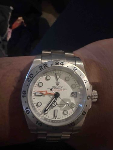 This is a luxury stainless steel wristwatch, specifically a Rolex Explorer II with a 'Polar' white dial, likely reference 216570 based on the 42mm case proportions and modern styling. The watch features a brushed 904L stainless steel Oyster case and an integrated Oyster bracelet. The dial is white with black-bordered 'Maxi' hour markers filled with Chromalight luminescence. A signature feature of this model is the bright orange GMT hand with an arrow tip, designed for 24-hour timekeeping in conjunction with the fixed, brushed steel bezel engraved with 24-hour graduations. The dial text includes the Rolex coronet, 'OYSTER PERPETUAL DATE', and 'EXPLORER II' in orange script. A date window with a magnifying Cyclops lens is positioned at 3 o'clock. Physically, the watch shows signs of regular wear, including light 'desk diving' scratches and micro-abrasions on the bezel and bracelet links. The sapphire crystal appears clear, and the screw-down Triplock winding crown is intact. The construction represents high-end Swiss horology, featuring an automatic movement with a GMT complication. This modern iteration of the cave-exploring professional watch dates from approximately 2011 to 2021, exhibiting robust craftsmanship and a utilitarian aesthetic.