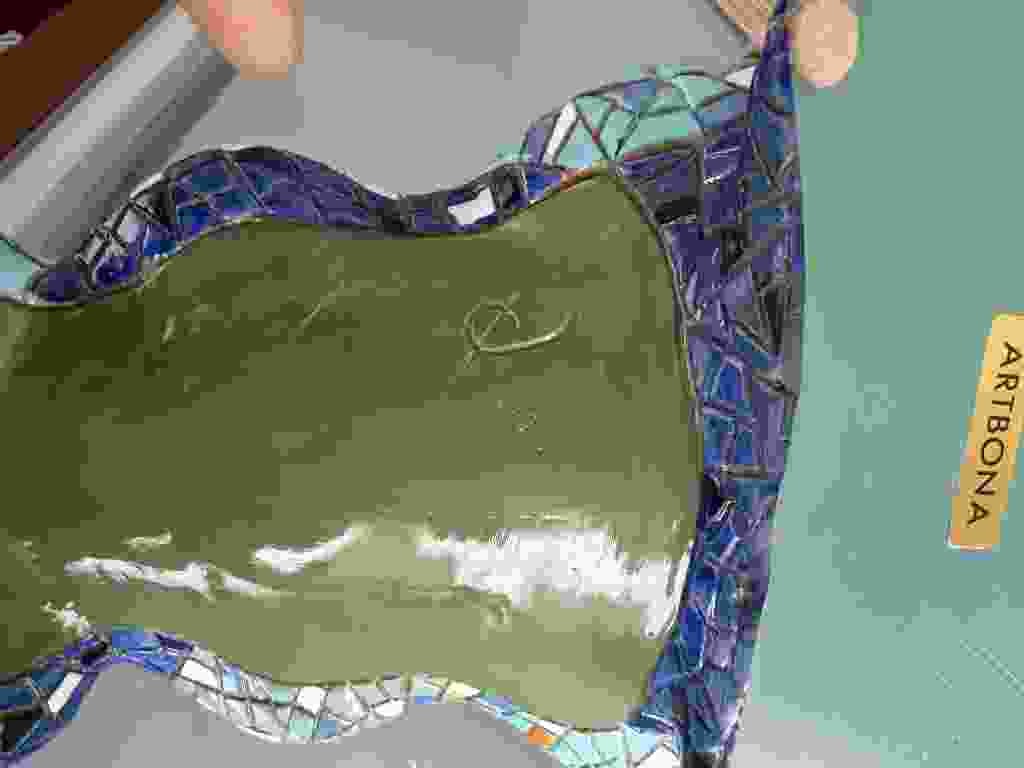 This is a contemporary figurative sculpture depicting a partial female torso, rendered in a three-dimensional form. The piece features a smooth, olive-green glaze on the central 'skin' area, contrasted with a decorative mosaic border. The mosaic is meticulously hand-applied, utilizing small, irregularly shaped shards of stained glass in varying shades of cobalt blue, royal purple, and turquoise, along with occasional white accents. The glass tiles are set within dark grout lines that define the intricate border following the organic curves of the body shape. A notable feature is an incised script signature or artist's mark located in the upper-right quadrant of the green glazed section, appearing as a stylized 'D' or 'P' with a sweeping flourish. In terms of condition, the piece shows some light surface scratches on the glazed green area and what appears to be a minor missing tile or chip in the lower-right mosaic section. The overall craftsmanship suggests a late 20th or early 21st-century studio art piece. The construction appears to be ceramic or mixed media base, providing a substantial feel to the sculptural form. The contrast between the matte glaze and the reflective, gem-like quality of the glass tiles indicates high-quality artistic intent.