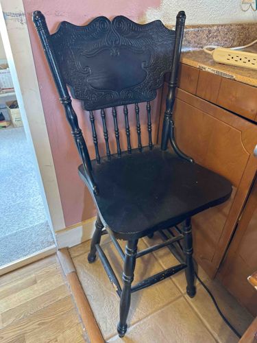 Swivel painted wooden high back chair/bar stool with spindles and etched back