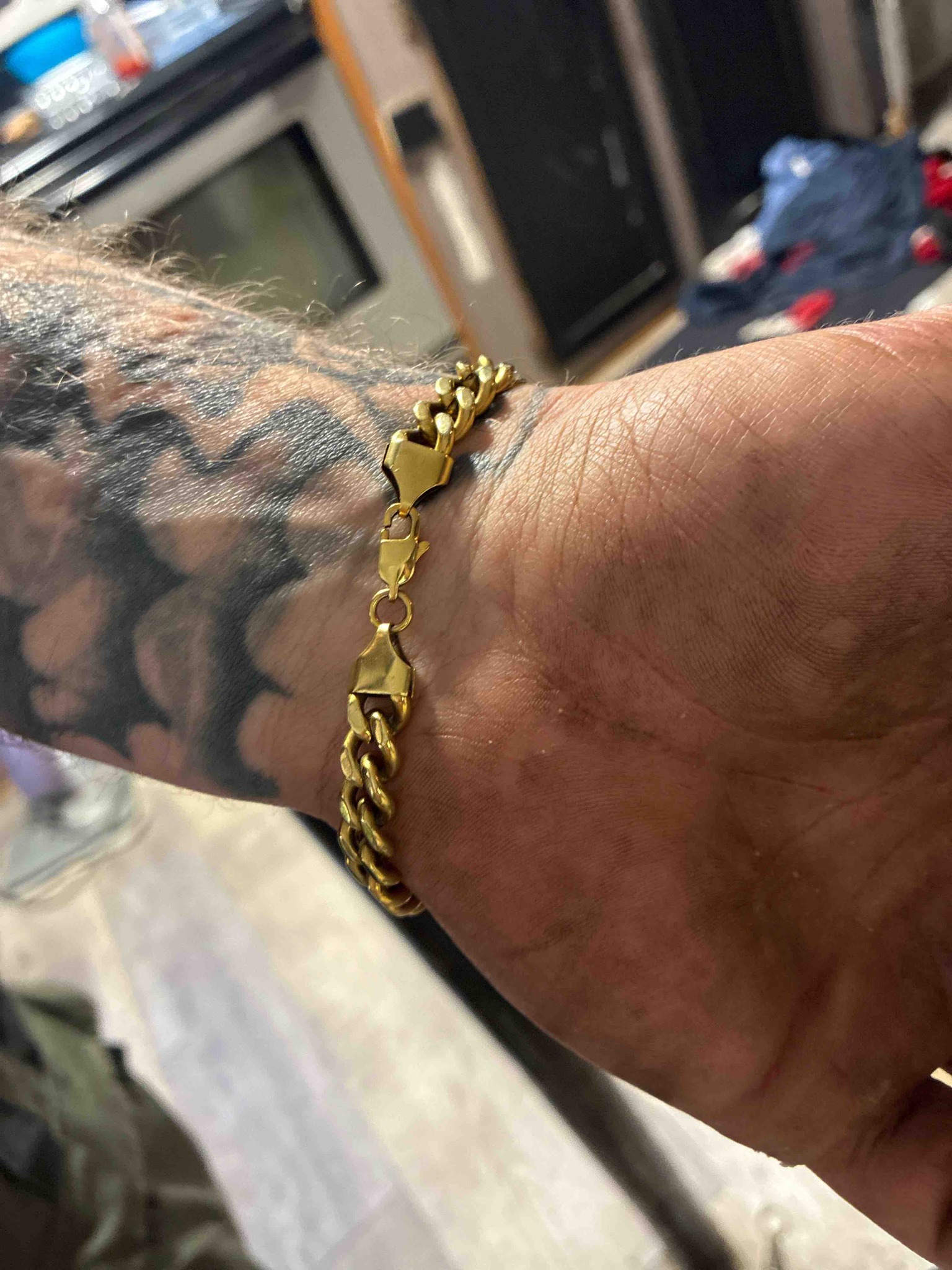 This item is a yellow gold curb link bracelet, likely between 8mm and 10mm in width, worn on a wrist. The chain features flat, interlocking circular links typical of a classic curb style, which provides a comfortable, low-profile fit against the skin. The construction appears sturdy, featuring high-polish finishes on the outer surfaces of the links. A notable feature is the secure lobster claw clasp mechanism, which is connected to the chain via decorative, shield-shaped end caps. These end caps transition the thick link profile down to the swivel and clasp assembly. While specific hallmarks are not clearly legible from this angle, the inner curve of the lobster clasp and the flat face of the end caps are common locations for fineness stamps (such as 10K, 14K, or 18K) and maker's marks. The condition shows minor surface scratches and a light patina consistent with regular wear, but the mechanical components of the clasp appear functional without significant deformity. The craftsmanship suggests a contemporary machine-made piece designed for durability and daily use. The overall style is a timeless piece of men's jewelry, often associated with late 20th-century to modern fashion trends.