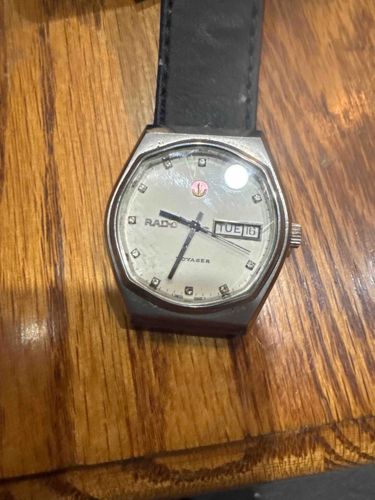 This is a vintage Rado Voyager automatic wristwatch, likely dating from the 1970s or 1980s. The watch features a distinctive octagonal stainless steel case with an integrated style. The dial is a light silver or sunburst finish featuring small crystal or diamond chip index markers at the hour positions. At the 12 o'clock position is the iconic Rado rotating anchor logo in red, which is a signature feature of their automatic movements. The dial prominently displays 'RADO' and 'VOYAGER' in black text, along with a day-date complication window at the 3 o'clock position. The hands are baton-style with dark inserts for legibility. The watch is currently paired with a black leather or synthetic strap that appears to be an aftermarket replacement rather than the original steel integrated bracelet. Regarding condition, the crystal shows significant scratching and surface abrasions, which obscure the dial clarity. The stainless steel case exhibits moderate wear with several small nicks and scratches on the bezel and lugs. The crown is original but shows signs of use. The craftsmanship is typical of high-quality Swiss watchmaking of the era, though the heavy patina and external wear suggest a lack of recent servicing or polishing.