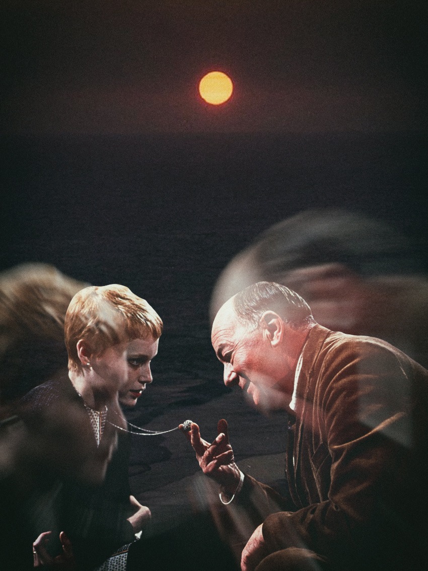 This item is a contemporary digital artwork created in a collage style, featuring iconic imagery from the 1968 film 'Rosemary's Baby'. The composition is vertically oriented and utilizes a dark, atmospheric color palette dominated by deep blacks, umbers, and ochres. At the top of the frame, a solitary, glowing orange celestial body—simultaneously resembling a sun, moon, or 'The Eye'—is positioned against a heavy, textured dark sky. The mid-ground reveals a spectral, double-exposed overlay of figures, adding a dreamlike or haunting quality to the piece. In the foreground, a crisp cutout depicts the characters Rosemary Woodhouse (Mia Farrow) and Dr. Abraham Sapirstein (Ralph Bellamy). A critical narrative element is highlighted: Dr. Sapirstein is shown holding or adjusting a silver locket (likely the tannis root locket) around Rosemary's neck. The digital 'grain' and filter application mimic the look of mid-century film stock and vintage magazine printing. The craftsmanship is evidenced by the careful layering of transparency, the sharp masking of the primary figures against a hazy background, and the deliberate use of light to create a sense of tension and psychological dread characteristic of the horror genre. No physical wear or damage is present as it is a digital file, though 'artificial aging' through digital noise is a stylistic choice.