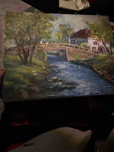This is an original oil (or possibly acrylic) painting on a rectangular canvas, executed in an impressionistic style. The composition features a prominent stone arched bridge spanning a tranquil river that flows toward the viewer. On the right bank, a two-story white house with a reddish-brown roof and dark shutters is nestled among lush green trees. Two figures appear to be crossing the bridge, while two small white birds, possibly ducks, are visible on the left grassy bank. The color palette is dominated by earthy greens, deep river blues, and muted browns, with visible, textured brushstrokes that suggest movement in the water and foliage. The lighting suggests an overcast day or late afternoon. While a specific signature is not immediately legible in the lower corners in this lighting, the work reflects a mid-to-late 20th-century aesthetic. The canvas appears to be unframed with some minor edge wear and surface grime consistent with age. The craftsmanship displays a confident handle of light and pastoral atmosphere, typical of a professional or highly skilled amateur artist working in the regionalist or impressionist tradition.