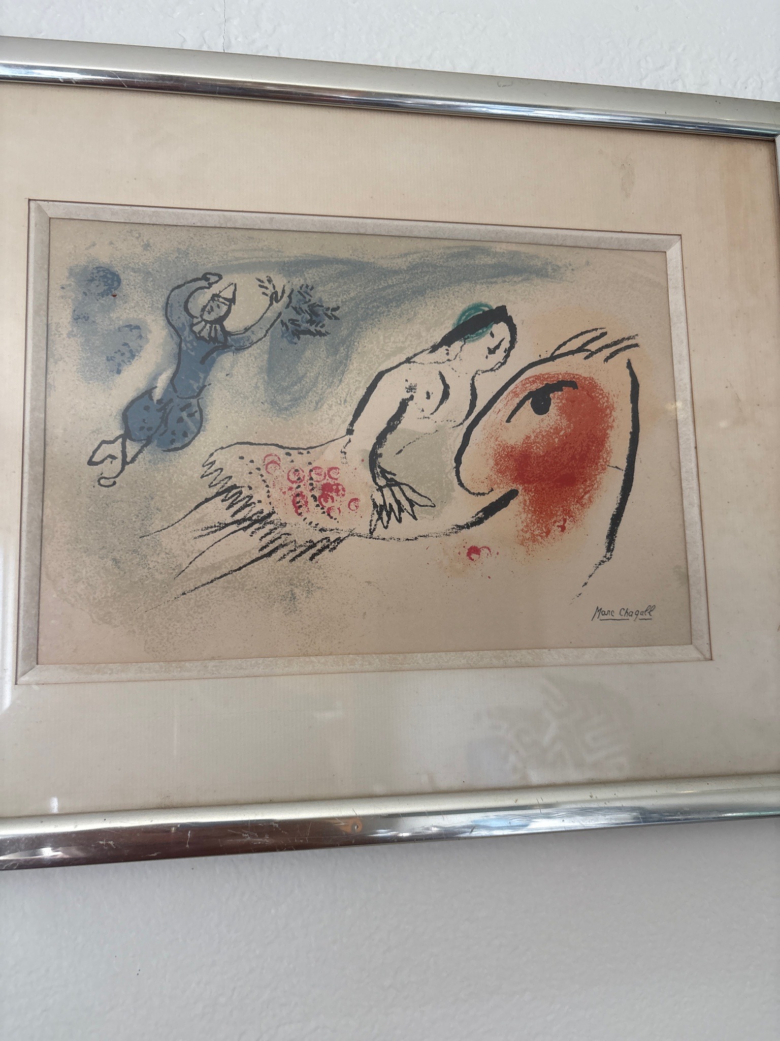 This is a color lithograph attributed to Marc Chagall, depicting a classic circus theme featuring a nude female rider on a horse and a floating clown figure. The piece exhibits the artist's signature dreamlike Surrealist style with ethereal, floating figures and a soft palette of blue, red, and muted tones. The composition shows the rider bending over a large horse head rendered with a vibrant red patch of color. In the upper left, a blue clown figure is suspended in the air. The work is signed 'Marc Chagall' in the lower right corner, which appears to be part of the plate rather than a hand-signature. The print is housed in a simple silver-toned metal frame with a wide, off-white mat. Regarding condition, there is notable yellowing and tanning (toning) across the paper, likely due to acidic matting or light exposure over time. Discoloration is especially visible along the edges of the mat window. There is some minor waving of the paper, though no direct vertical tears are visible from this perspective. The craftsmanship shows typical mid-20th-century lithographic techniques with textured, grainy color applications characteristic of the Mourlot Frères workshop in Paris. Based on the style, this appears to be a mid-century print, likely from the 1960 collection 'Lithographe I'.