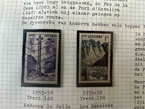 This item consists of two vintage postage stamps issued by the French postal administration in Andorra during the period of 1955 to 1958. These stamps are part of a definitive series showcasing local landscapes and landmarks. The first stamp, on the left, features the 'Croix Gothique' (Gothic Cross) in Andorra la Vella. It is printed in a deep violet-purple tone and has a denomination of 20F. The stamp exhibits a clear 'wavy line' cancellation mark, indicating it was used. The second stamp, on the right, depicts 'Les Escaldes' with a dramatic view of the Pyrenees mountains. It is printed in a dark green and black bi-color scheme with a 1F denomination. This stamp appears to be mint or very lightly cancelled. Both stamps are vertically oriented rectangles with traditional perforated edges. They are mounted on black hinges or mounts within a collector's album. The album page features typewritten text in Dutch, identifying the locations and providing cataolog references (Yvert 148 and Yvert 138). The paper shows minor signs of aging, with a light off-white tone, but the stamps themselves maintain good color saturation. The engraving is sharp, typical of French stamp production from the mid-20th century, displaying high-quality craftsmanship in the fine line-work used to create shadows and texture in the mountain scenery.