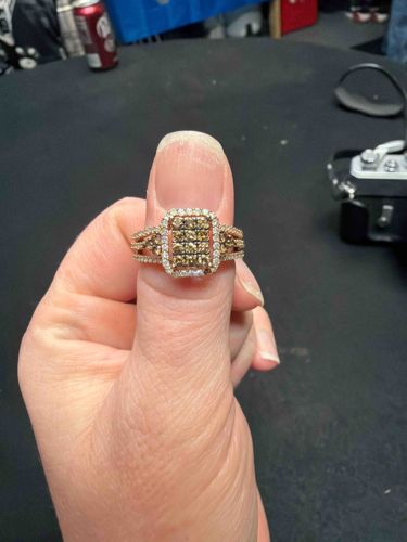 This is a contemporary fashion ring, likely crafted in 10k or 14k rose gold, featuring a multi-stone cluster design. The central focal point is a rectangular 'hidden' cluster of nine round brilliant-cut champagne or cognac-colored diamonds, arranged in a tight 3x3 grid to mimic the appearance of a single large cushion or emerald-cut stone. This central cluster is encircled by a halo of small, round brilliant-cut white diamonds set in a pavé or micro-prong style. The ring features a sophisticated split-shank design that broadens as it approaches the head. Each side of the shank is adorned with three rows of diamonds: a central row of champagne diamonds flanked by two outer rows of white diamonds. The metal's warm pinkish hue suggests a modern rose gold composition, which complements the earth tones of the colored diamonds. The craftsmanship indicates a commercial high-jewelry production style, common in the early 21st century. Condition appears excellent with no visible missing stones or significant deformation of the band. The setting is elevated with an open gallery to allow light penetration, enhancing the fire and brilliance of the stones.