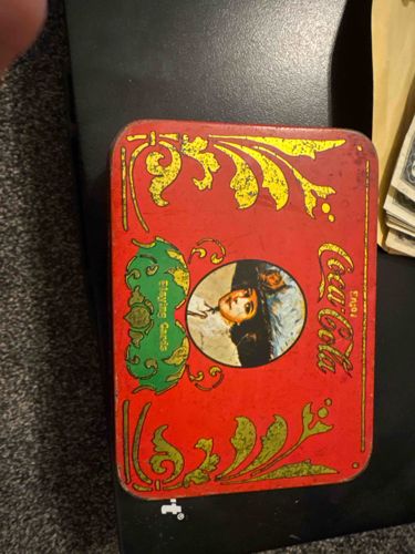 This is a rectangular metal storage tin designed to house playing cards, featuring vintage Coca-Cola branding. The item is predominantly bright red, consistent with the classic Coca-Cola color scheme, and is decorated with ornate gold-toned flourish or acanthus leaf motifs in the corners and sides. A central circular inset depicts a 'Gibson Girl' style portrait of a woman in a wide-brimmed floral hat, likely a reproduction of early 20^th-century advertising art used by the brand (specifically the 1907 or 1914 girl). To the right, the words 'Enjoy Coca-Cola' are printed in the iconic Spencerian script. On the left, a green scroll-like graphic contains the text 'Playing Cards.' The tin shows significant signs of age and wear, including noticeable surface abrasions, paint loss, and oxidation particularly on the gold flourishes and the edges. The patina suggests a mid-to-late 20^th-century reproduction of a turn-of-the-century design. The construction is pressed tin with rounded corners, and the lid appears to be a separate friction-fit piece. The overall condition is fair to good, with the central illustration remaining largely intact despite the weathered appearance of the surrounding graphics.