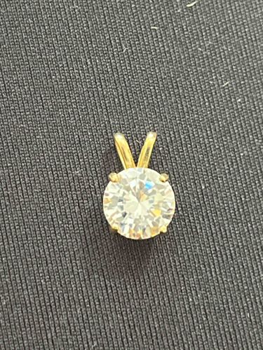 This item is a classic jewelry pendant featuring a single round brilliant cut colorless gemstone. The stone is estimated at approximately 1.00 to 1.50 carats based on visual scale and is held in a traditional four-prong setting crafted from yellow gold (likely 10k or 14k based on common industry standards). The gemstone displays high brilliance and dispersive fire, suggesting it is either a natural diamond, a high-quality lab-grown diamond, or a stimulant such as cubic zirconia. The setting is integrated with a simple V-shaped rabbit-ear bail at the top, designed to accommodate a fine link chain. The construction appears to be a standard machine-cast commercial find from the late 20th to early 21st century. In terms of condition, the metal surfaces show minor micro-scratching consistent with light handling or display. The prongs appear to be well-aligned and intact, securely gripping the stone's girdle. No visible hallmark or maker's mark is discernible from this frontal view, though such stamps would typically be found on the interior of the bail or the back of the gallery. The stone appears eye-clean with no significant surface-reaching fractures or chips visible, maintaining a high level of transparency and light return characteristic of modern brilliant faceting.