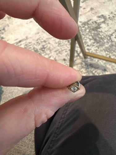 This item is a single stud earring featuring a small, brilliant-cut clear stone, likely a diamond or a high-quality substitute, set within a geometric yellow gold mounting. The setting is a squared-off, lozenge-shaped bezel that creates a tailored, Art Deco-inspired silhouette. In terms of physical characteristics, the earring is diminutive in size, suitable for either a primary or secondary lobe piercing. The metal appears to be a high-karat yellow gold based on its rich, warm hue. The construction utilizes a classic bezel setting which secures the stone flush within the metal frame, providing both protection for the stone and a clean, modern aesthetic. While no hallmarks are visible in the photograph, the craftsmanship suggests a late 20th-century to early 21st-century manufacturing date, mimicking the geometric styles of the 1920s. Regarding condition, the earring shows slight signs of wear consistent with regular use, including very fine surface scratches on the metal mounting. There is no visible damage to the tabletop or facets of the stone. The post is straight and appears to be integrated directly into the back of the setting. The quality of the stone shows decent fire and brilliance even in natural indoor lighting, suggesting good clarity and cut.