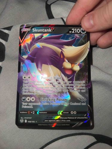 This is a Skuntank V Pokémon trading card from the 'Silver Tempest' expansion set, released in 2022. The card features vibrant, dynamic artwork by MUGENUP, depicting the Skuntank character lunging forward with energy effects. As a 'V' card, it possesses a holographic foil finish that produces a rainbow-like sheen when catching the light. The card displays a Darkness-type classification with 210 HP and includes two specific attacks: 'Pursuit Blast' and 'Shrieking Poison'. The bottom left corner identifies it as card number 108/195. Physically, the card appears to have standard rounded corners and a black border typical of V-series cards from the Sword & Shield era. Regarding condition, there is visible edge wear and whitening, particularly on the top right corner and along the upper edge where it is being held. The surface shows some light smudging and minor vertical scratches consistent with handling without a protective sleeve. The centering seems slightly weighted towards the bottom, but generally acceptable for a modern mass-produced card. This is a common Ultra Rare card highly recognizable to collectors of the modern Pokémon TCG.